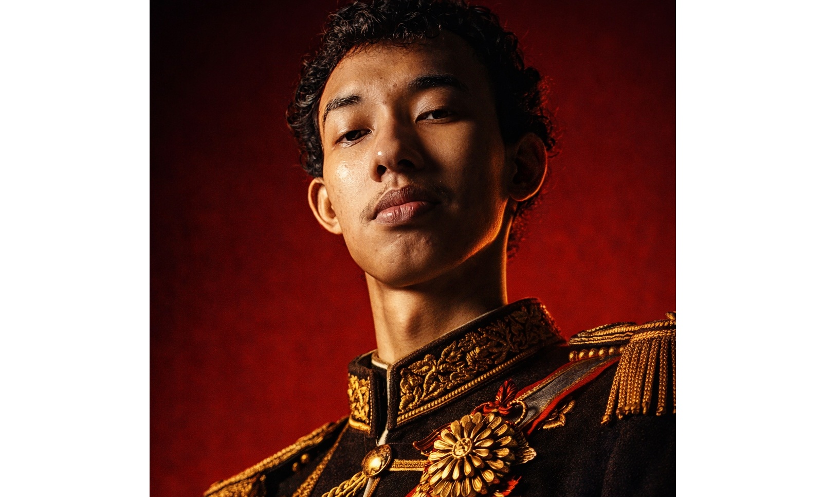 Prompt kesatu: “A hyper-realistic, cinematic portrait of man in a vintage, highly decorated military uniform. The uniform is black with intricate gold embroidery, epaulettes, and buttons, and is covered in various medals and insignia. The lighting is dramatic and chiaroscuro, casting strong highlights and deep shadows on his face and form. The background is a textured, deep red. The overall style is reminiscent of a historical photograph, with warm, rich tones.Original. Ratio 9:16”
