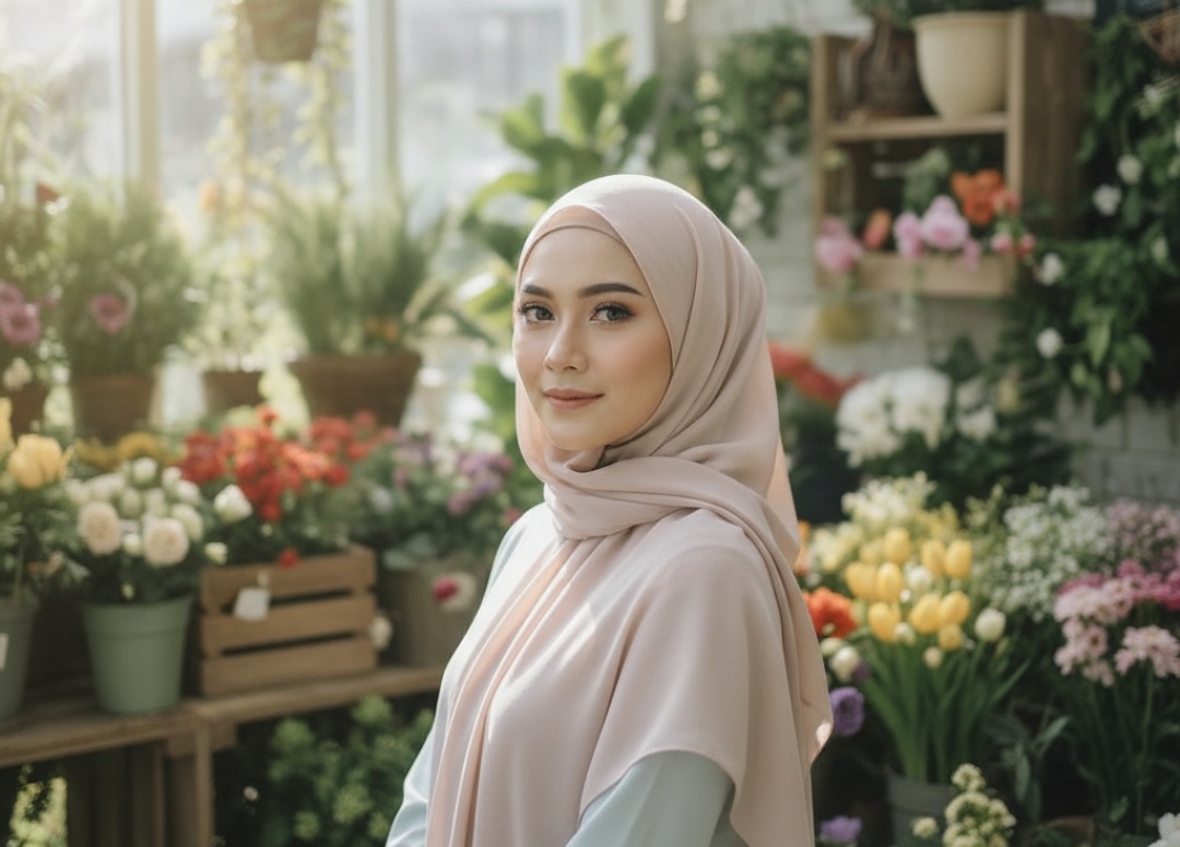 Prompt 3: Edit potret wanita berhijab ini dengan sentuhan flawless yang halus dan realistis. Tingkatkan detail mata agar lebih hidup, cerahkan wajah secara natural, dan seimbangkan highlight serta bayangan. Gunakan tone warna netral atau soft warm untuk kesan elegan dan aesthetic. Hindari efek edit yang terlalu tajam atau berlebihan.